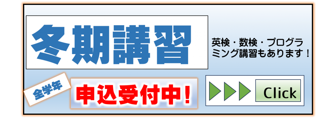 - 2025年11月28日 2025年冬期講習の受講申し込みの受付を開始しました! 経験豊富な講師陣が丁寧に指導!一人一人のレベルに合わせた親身の指導で目標達成をサポートします。詳しくは左のバナーをクリックして下さい!